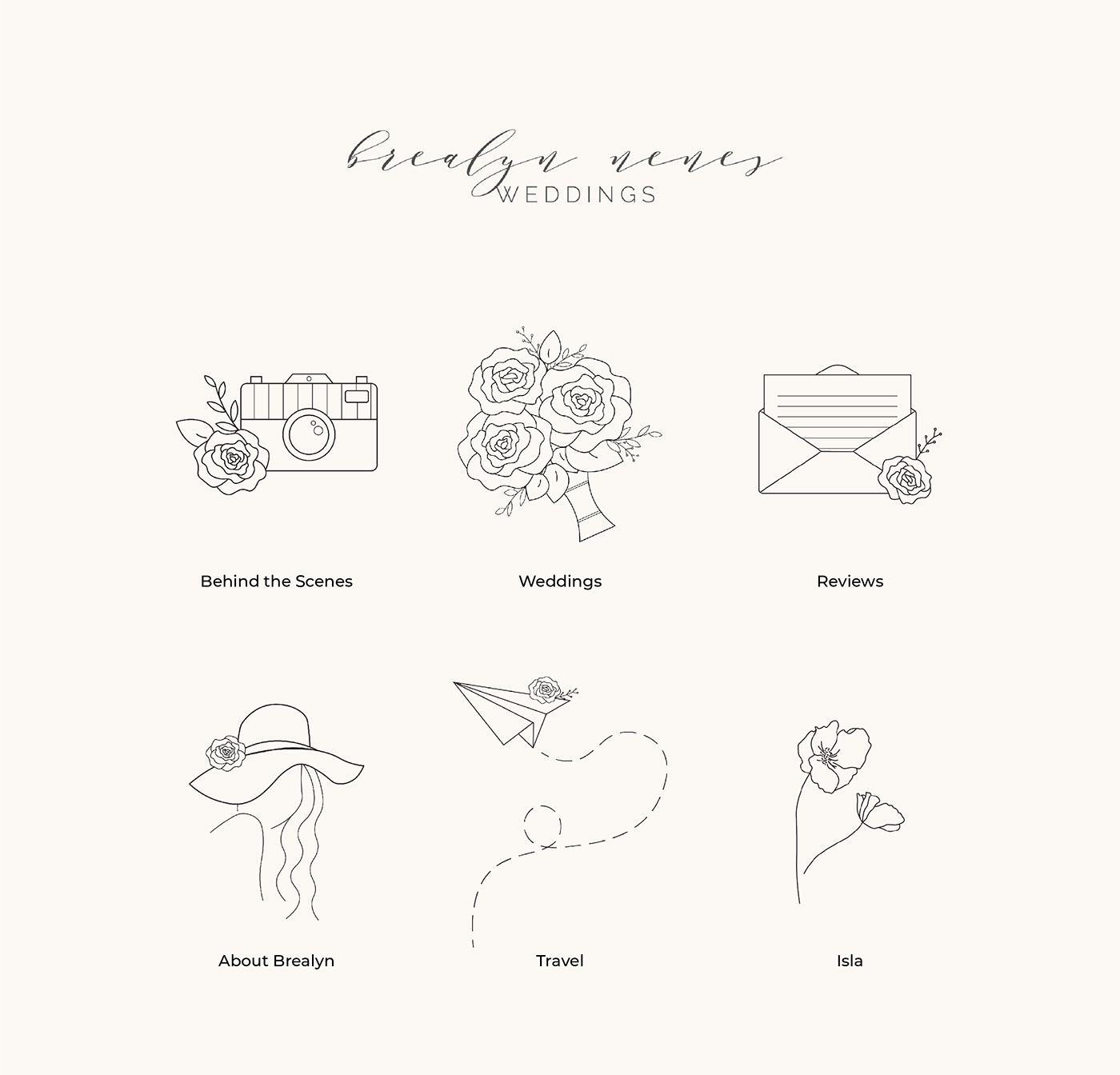 This page shows a library of past iconography and simple illustration projects for various brands for uses ranging from Instagram highlight covers to diagrams.